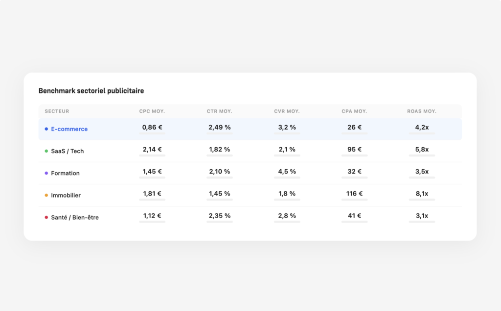 Comparez vos performances publicitaires aux moyennes de votre secteur : CPC, CTR, taux de conversion et ROAS.