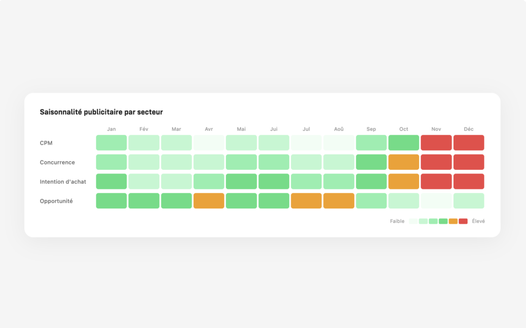 Identifiez les pics et creux de saisonnalité publicitaire par secteur pour ajuster vos budgets.
