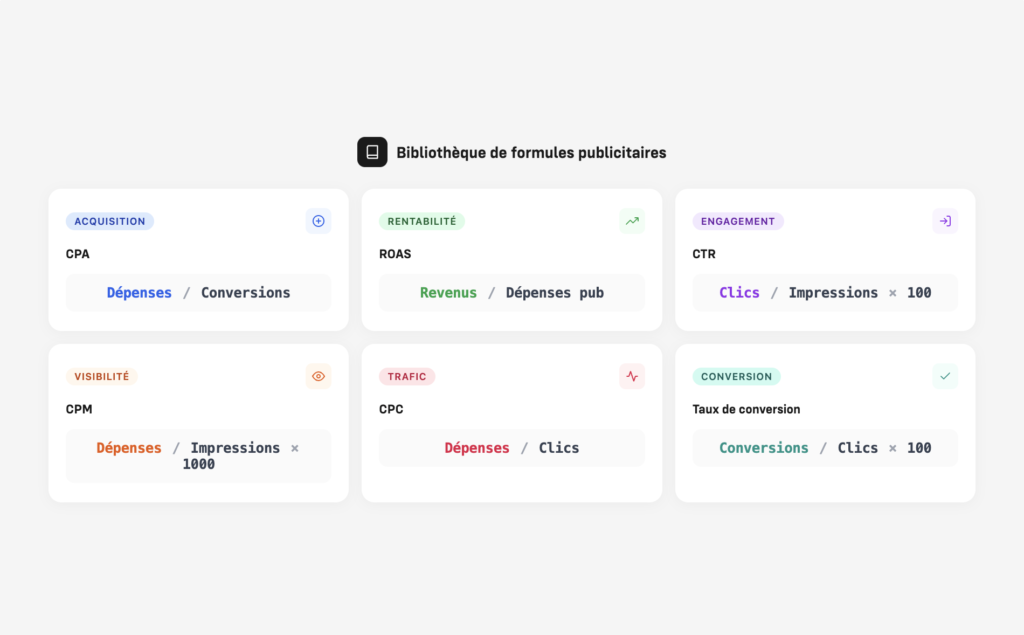 Toutes les formules publicitaires essentielles avec calculateurs intégrés : ROAS, CPA, CPL, CTR.