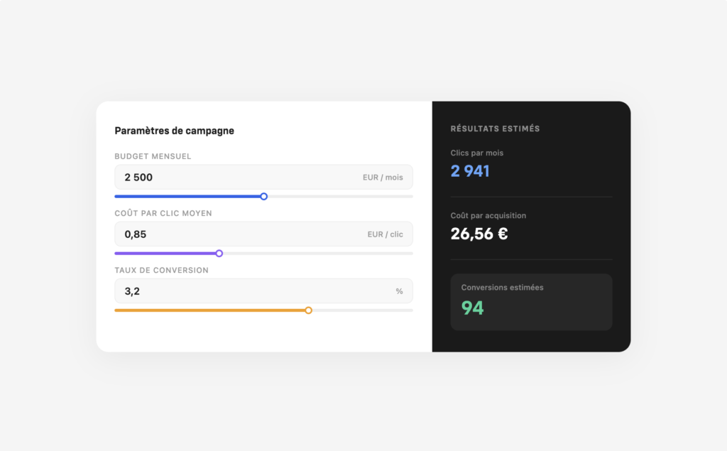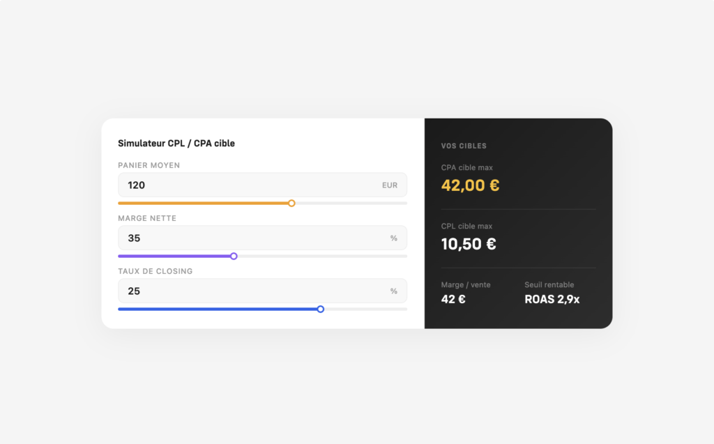 Simulez votre coût par lead et coût par acquisition cible pour calibrer vos campagnes.