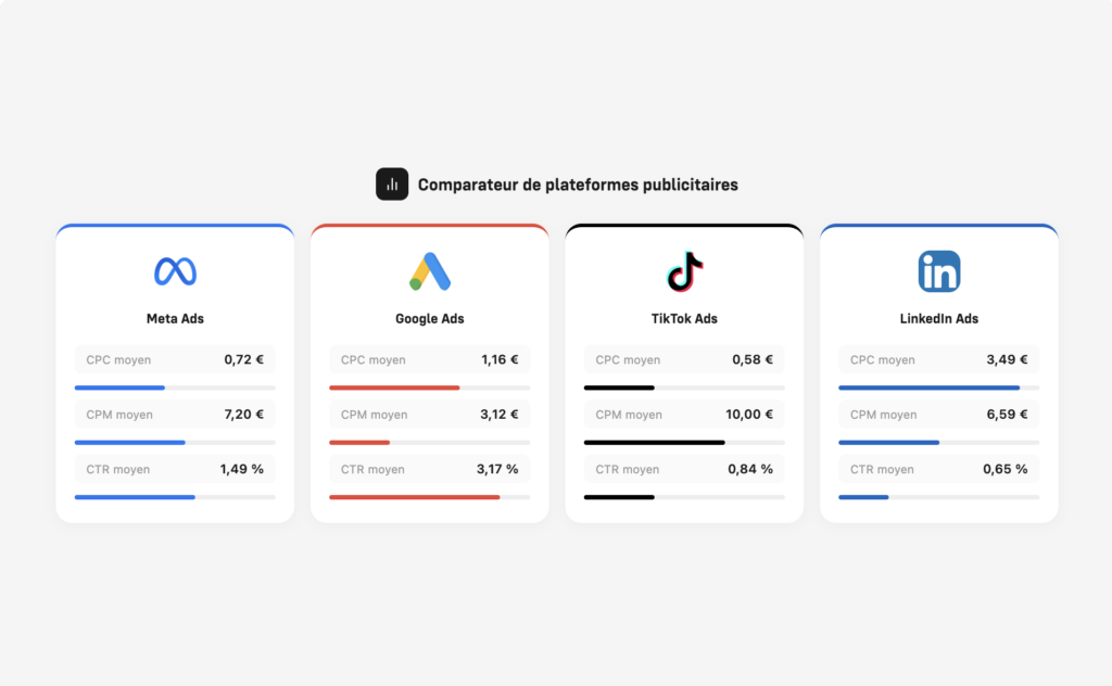 Comparez Google Ads, Meta Ads, TikTok Ads, LinkedIn Ads et Microsoft Ads pour choisir vos canaux.